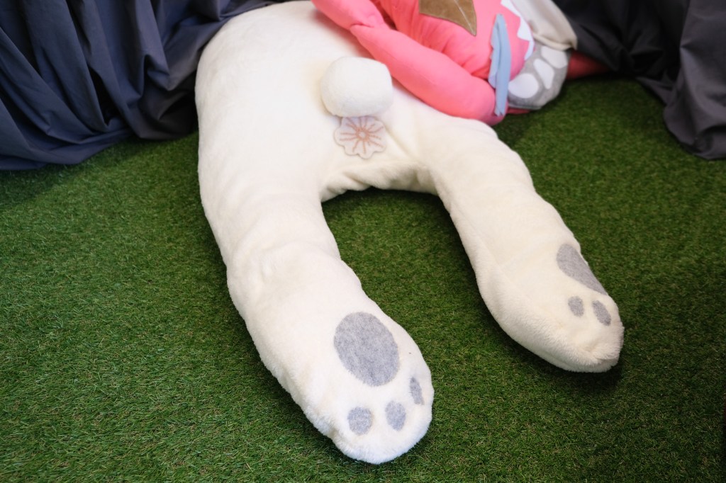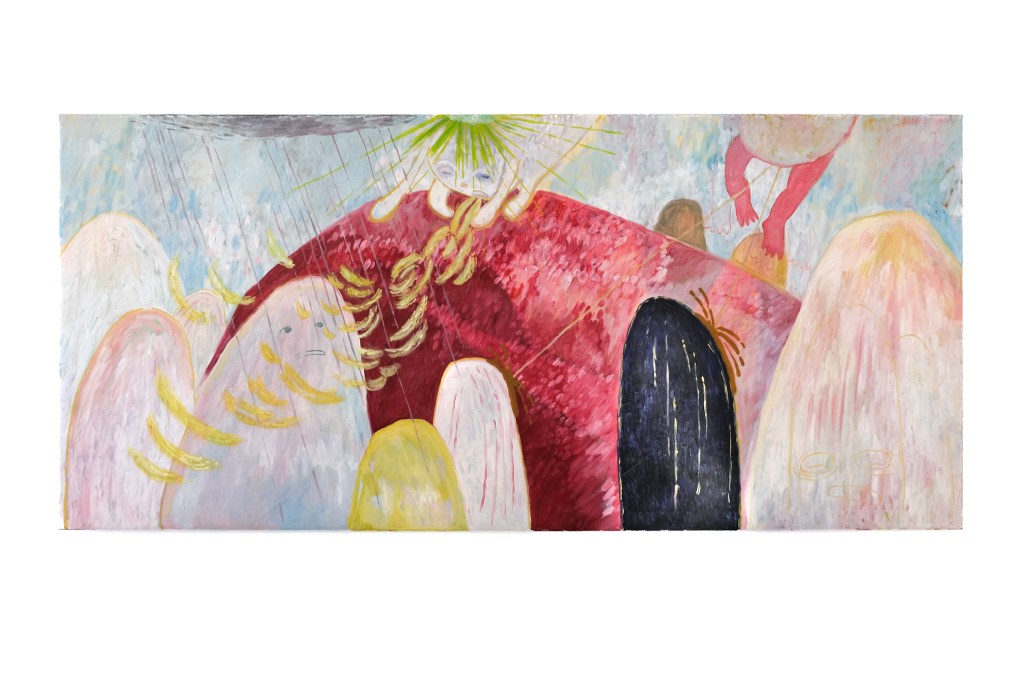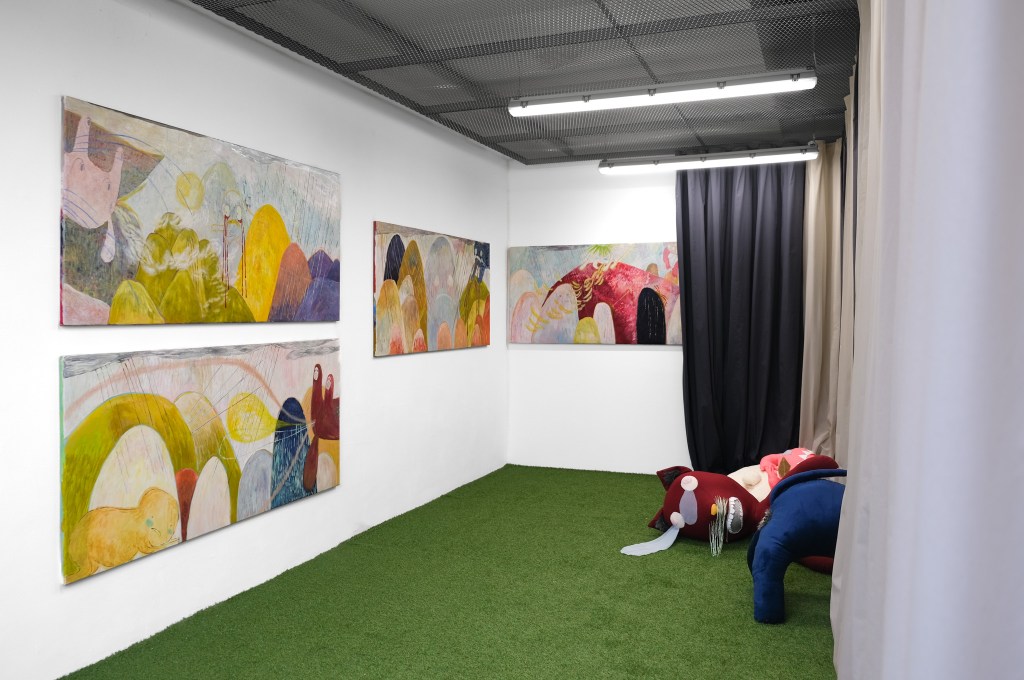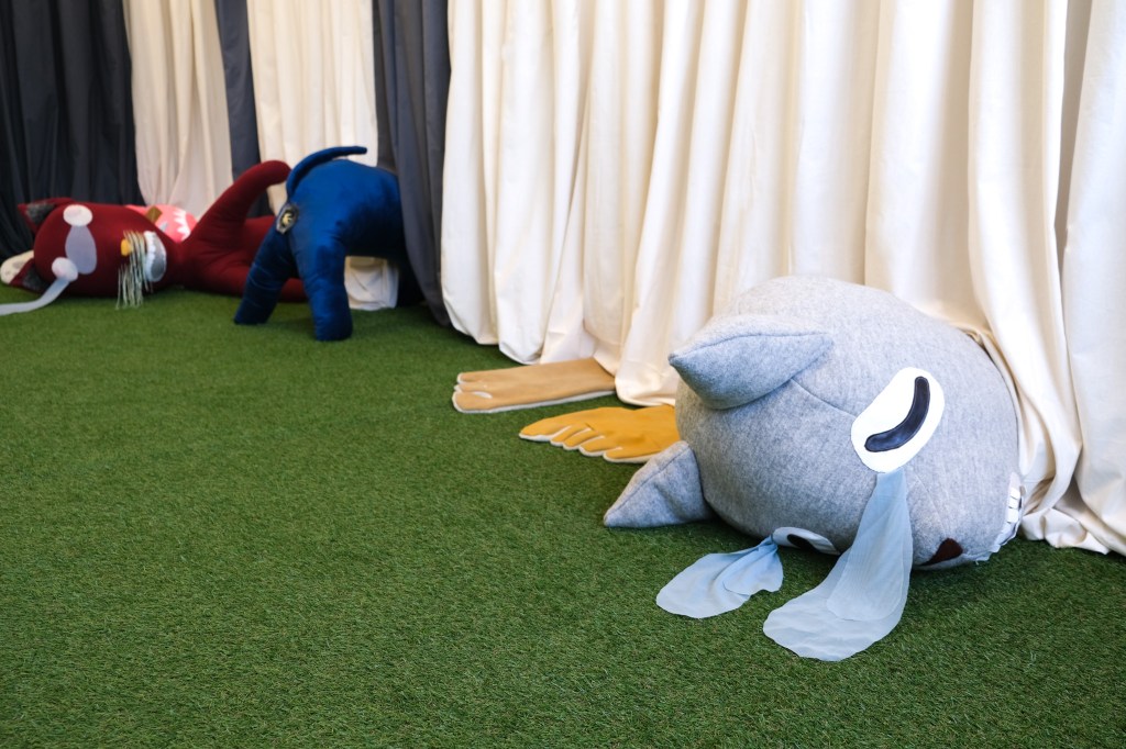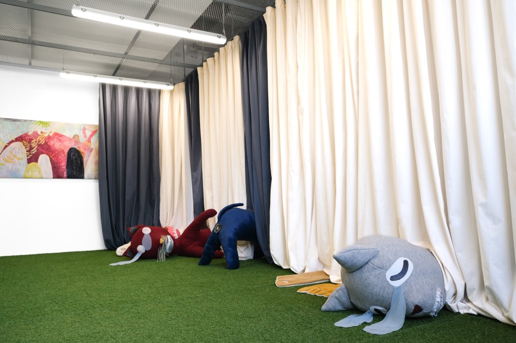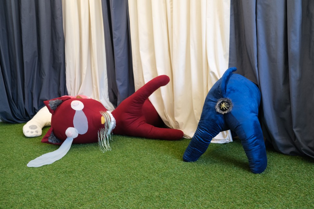 Small animal-like creatures appear at the edges of the paintings. Their fragmented bodies, gestures of paralysis, crying or falling refer to inner states of overload and exhaustion. The presence of the figures expand into the room. Along a floor-to-ceiling curtain lie soft sculptures resembling oversized stuffed animals. They seem to crawl, lie or glide under the curtain, with only the parts visible which have been cut off at the edge of the paintings. The soft sculpture figures reflect the inner psychological states of a subject in a contemporary high-functioning society. In a traditional sense, stuffed animals provide comfort and security, whereas in this case they themselves appear to be exhausted and demand care and affection from the viewer.